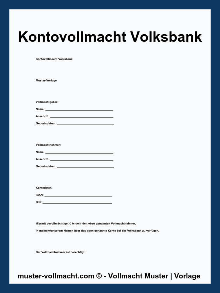 Kostenloses Muster für Vollmacht zur Kontoverfügung herunterladen – gültig für alle bestehenden und zukünftigen Konten und Depots bei Ihrer Bank oder Sparkasse. Einfach und rechtssicher nutzen.