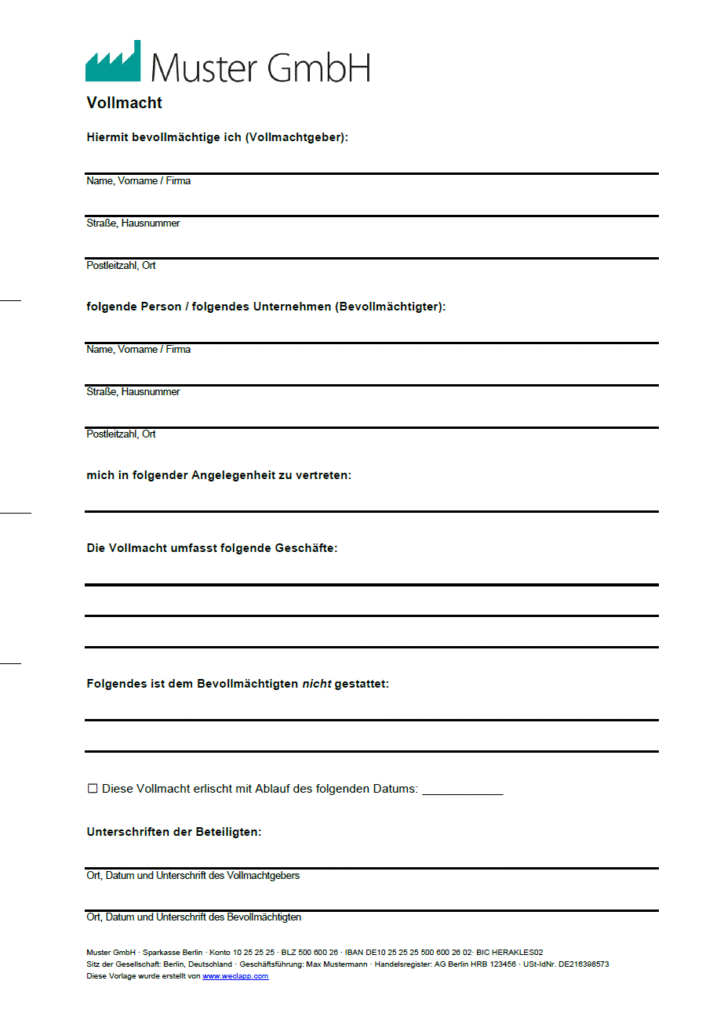 Kostenloses Muster für eine Vollmacht zum Herunterladen – einfach ausfüllen und rechtlich wirksame Vertretung sicherstellen. Ideal für private und geschäftliche Zwecke.