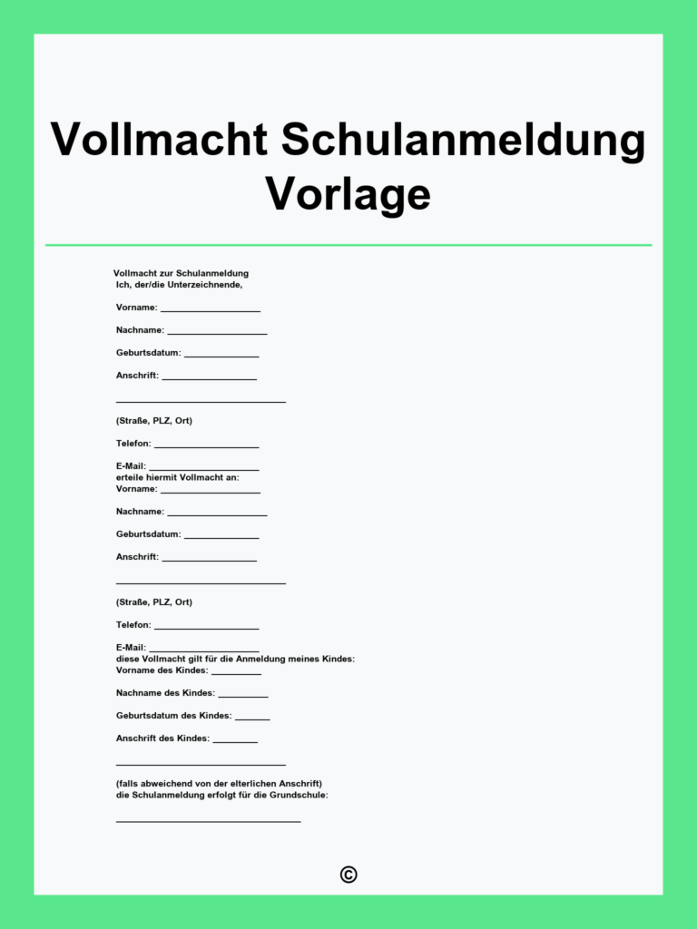 Kostenloses Muster für Vollmacht zur Schulanmeldung herunterladen – erleichtern Sie die Anmeldung Ihres Kindes mit einer rechtssicheren Vollmacht für Personensorgeberechtigte.