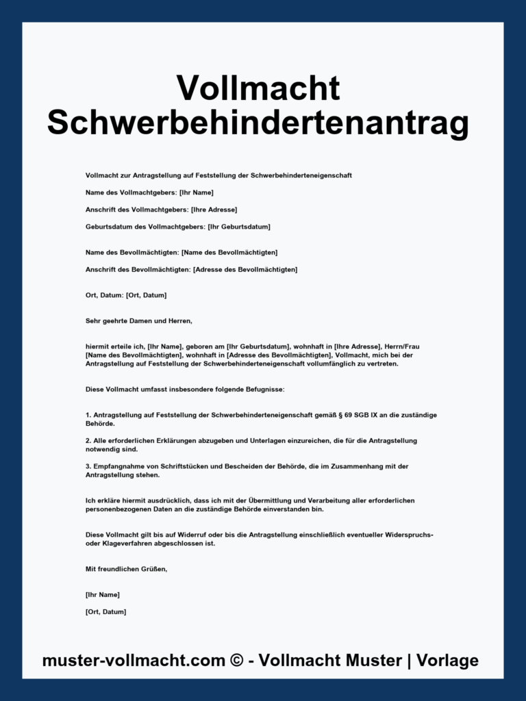 Kostenloses Muster für eine Vollmacht zum Schwerbehindertenantrag herunterladen und Bevollmächtigte rechtlich sicher im Antragsverfahren vertreten lassen. Schnell und unkompliziert nutzbar.