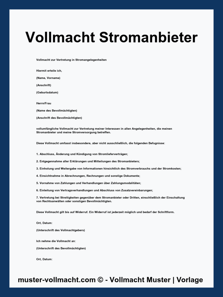 Kostenlose Vollmacht Muster für Stadtwerke herunterladen – klare und rechtssichere Vorlage zur Erteilung der Unterschriftsvollmacht für Kunden. Einfach ausfüllen und nutzen.