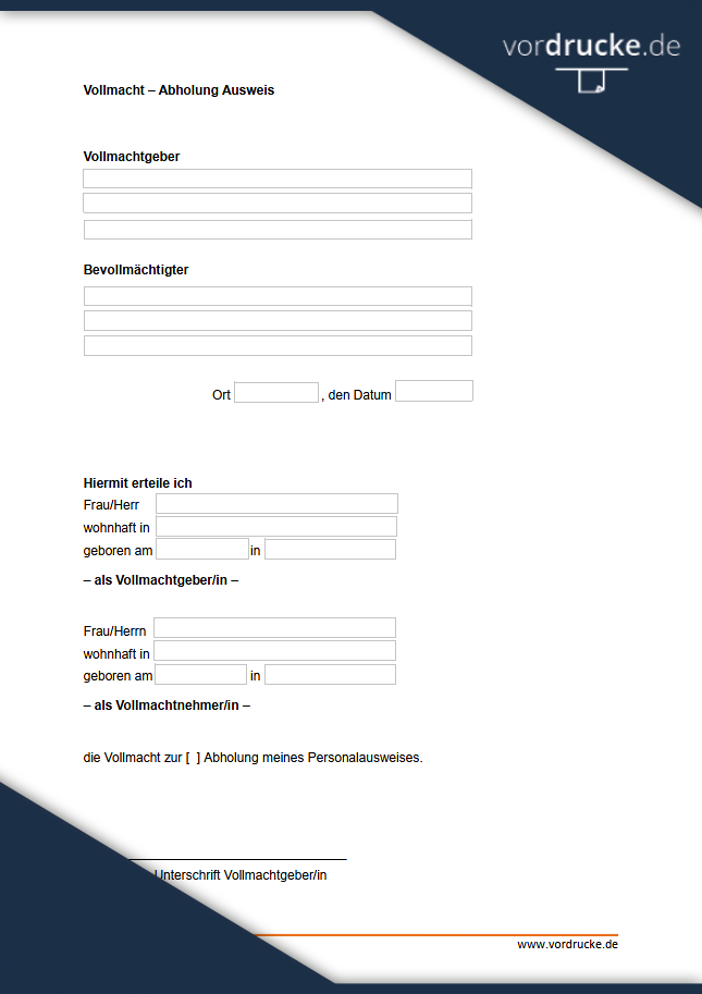 Kostenloses Vollmacht Muster zum Download – bevollmächtigte Person benötigt gültigen Ausweis, darf PIN nicht eingeben. Ideal für unkomplizierte Abholung und rechtssichere Vollmachten.