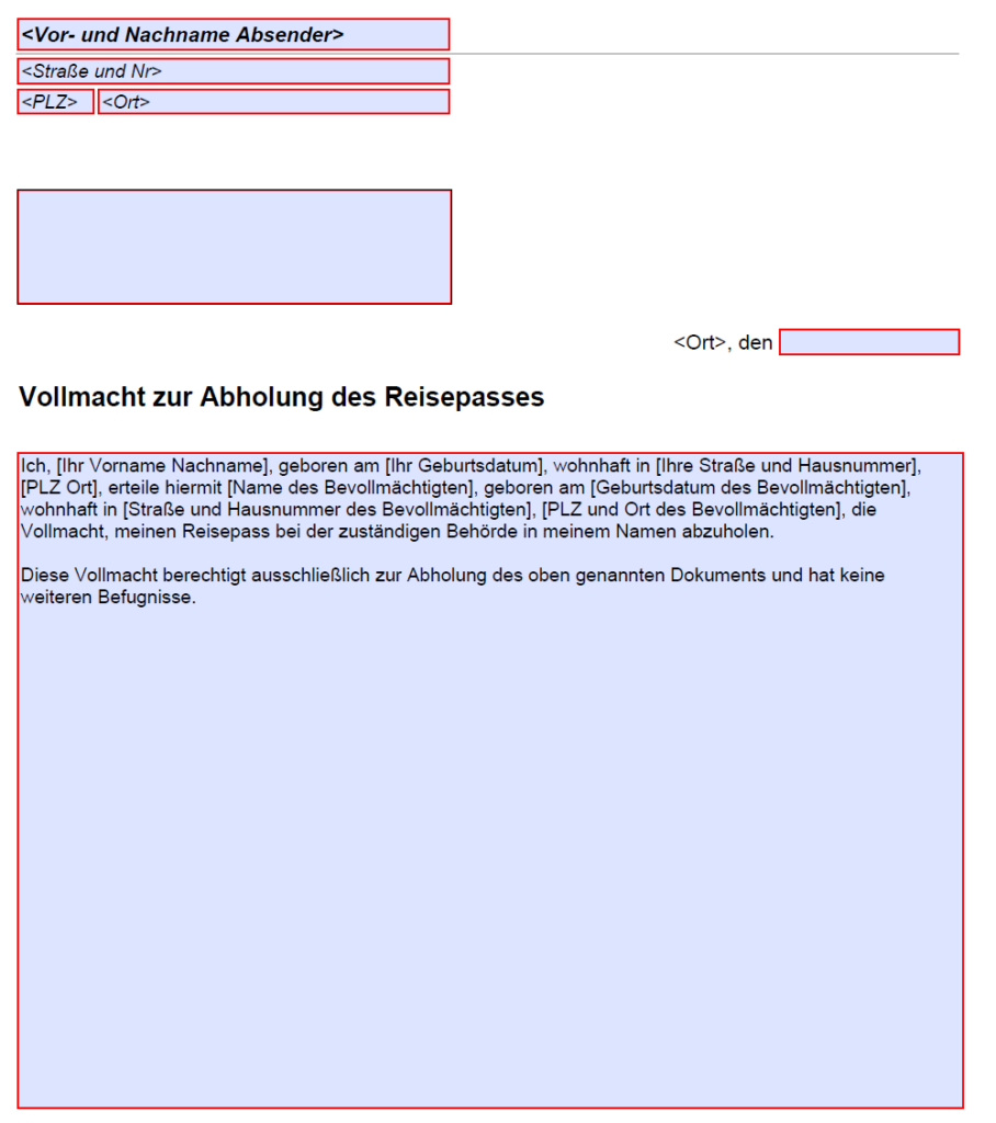 Kostenloses Vollmacht Muster zum Reisepass Abholen herunterladen. Einfach ausfüllen, alte Reisepass mitbringen und Bevollmächtigten zur Identifikation bereithalten. Praktisch und schnell.