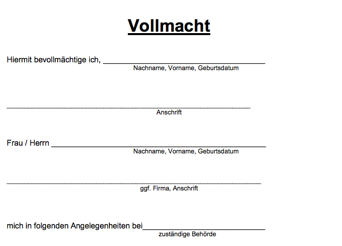 Kostenlose Muster-Vollmacht für Behörden herunterladen, um eine Vertrauensperson für Ihre Anliegen rechtsgültig zu bevollmächtigen. Einfach ausfüllen und sofort nutzen.