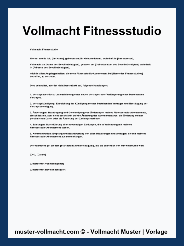 Kostenloses Muster für Vollmacht zur Anmeldung Ihres Kindes im Fitnessstudio [Name des Studios]. Einfach herunterladen und Ihrem Kind die Anmeldung ohne Ihre Anwesenheit ermöglichen.