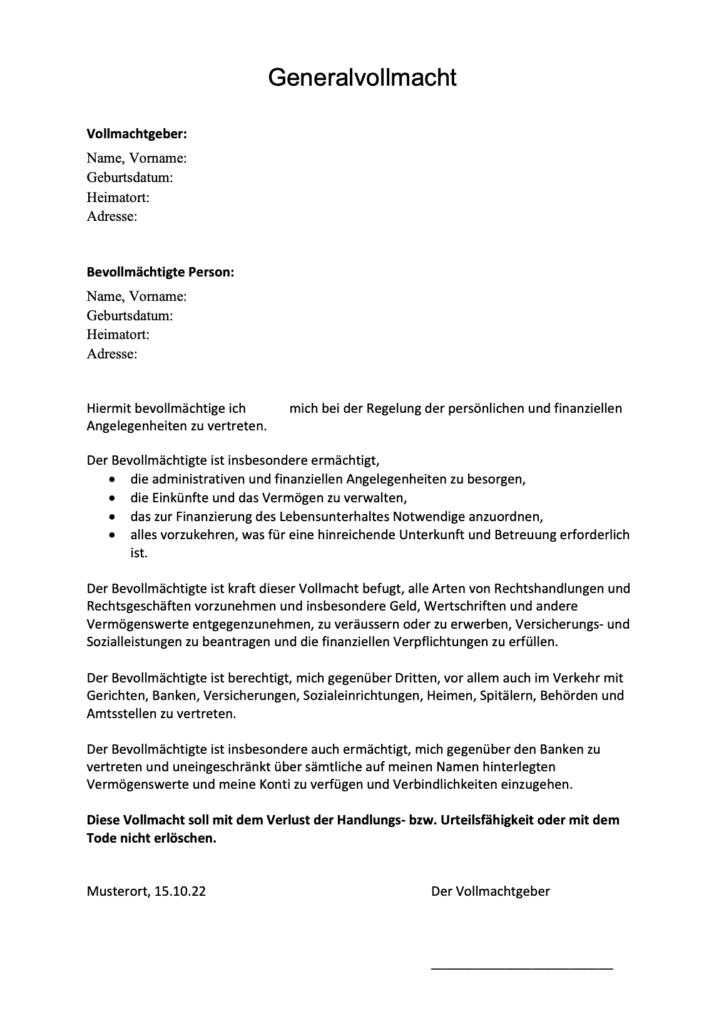 Kostenlose Muster Vollmacht für Privatpersonen in der Schweiz zum Download. Ermöglicht umfassende rechtliche Handlungen und Transaktionen, einschließlich Geldgeschäfte und mehr. Schnell und einfach verfügbar.
