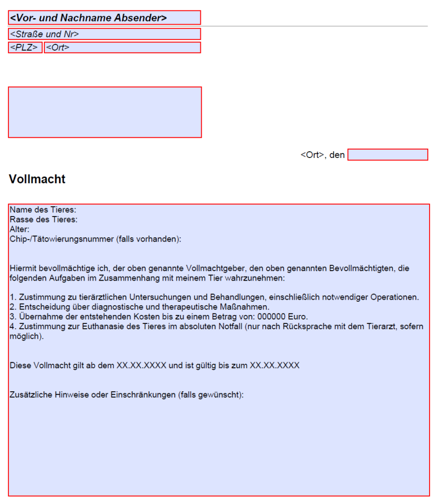 Kostenloses Vollmacht Muster für Tierarztbeauftragung bei Pferden. Erlaubt benannten Personen im Notfall schnell und rechtssicher eine Behandlung ohne Absprache mit Ihnen. Einfach herunterladen.